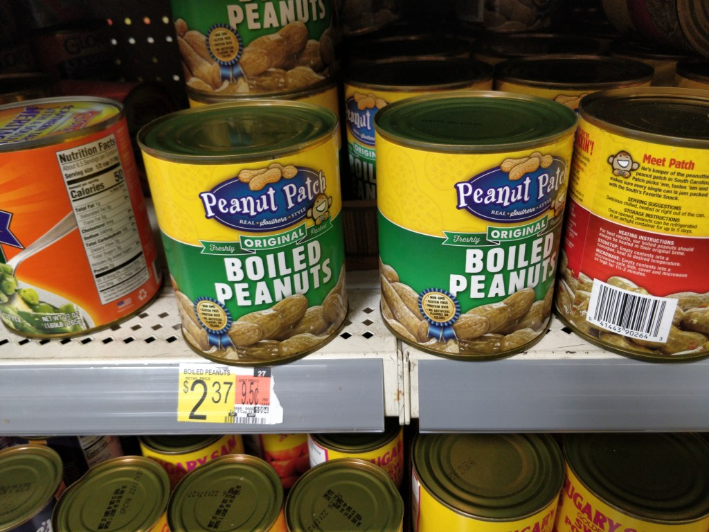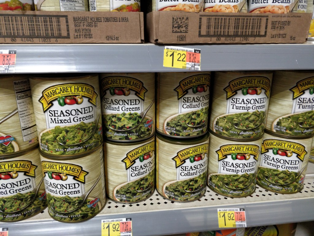 Grocery stores (and Walmart) are a great place to pick up these regional foods, too. Grits, collard greens, turnip greens, black eyed peas, and boiled peanuts are common stock.