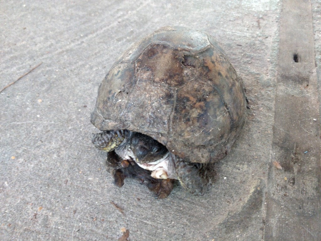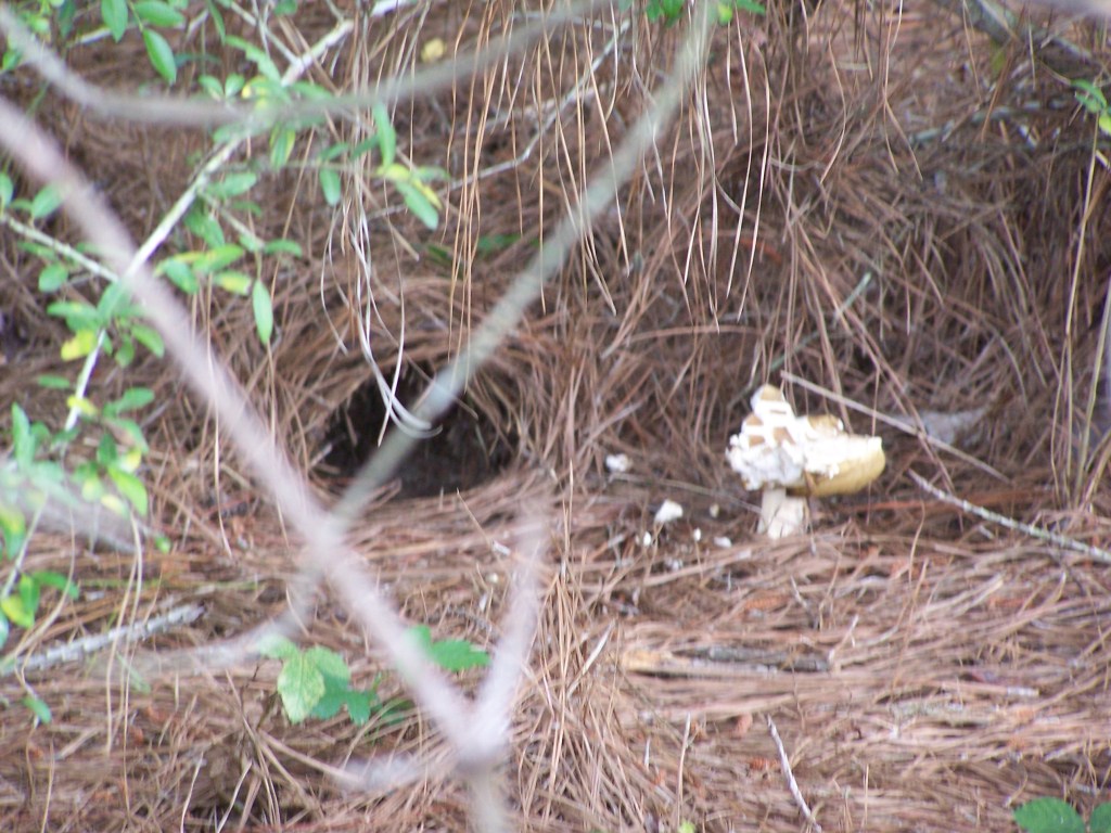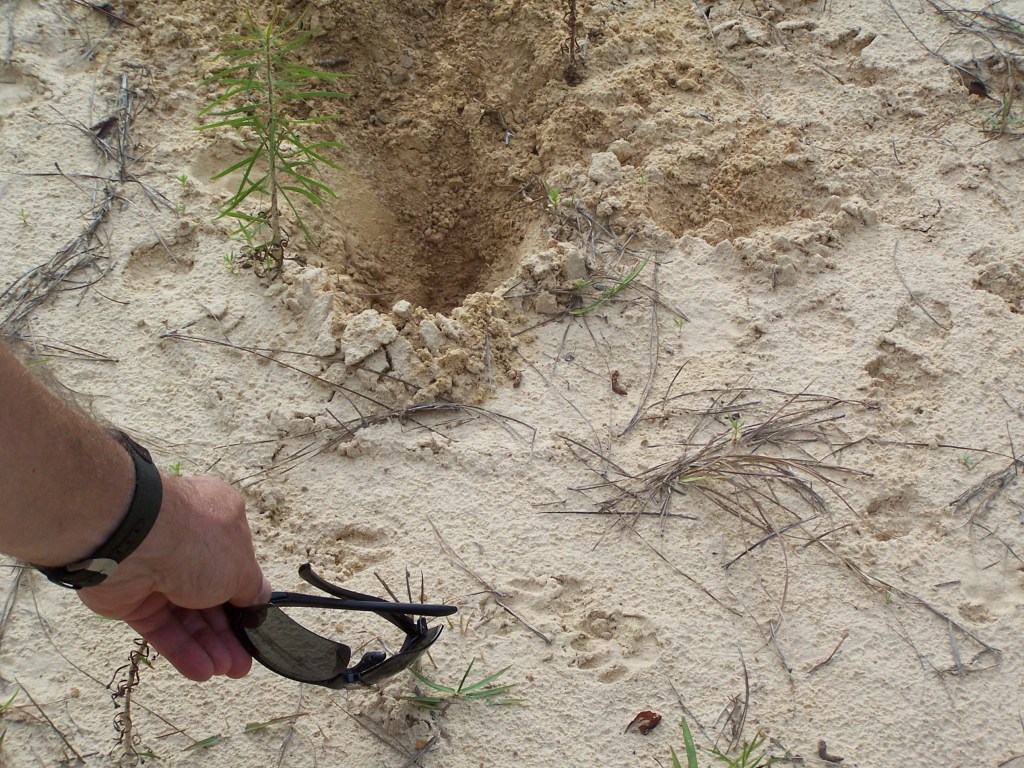 This mound is made by crawfish. We saw many of these from Alabama to eastern Texas on the trails near water sources. They seem to be a favorite thing to eat by humans and armadillos alike. We saw crawfish traps in the swamp as well as managed crawfish ponds (like rice patties) where small paddlewheel flat bottom boats harvested from evenly spaced submerged cages.