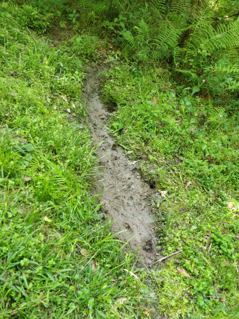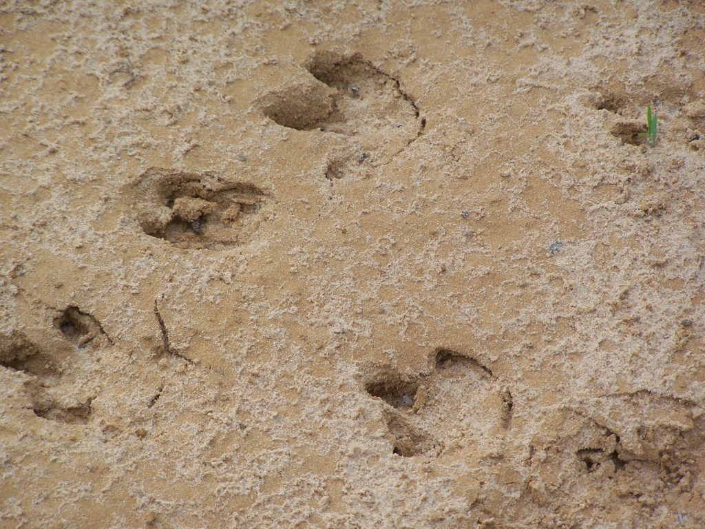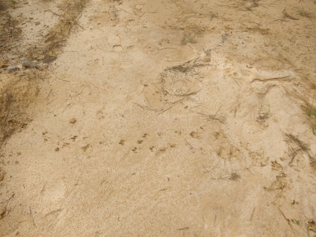 Where there isn’t water, the ground is sandy with light brown and reddish powdery soil. Much to our delight, animal tracks made in the wet weather harden and are preserved as the ground dries. The river-swamp wetness provided a variety of tracks which in turn led us to finding other remnants of activity.