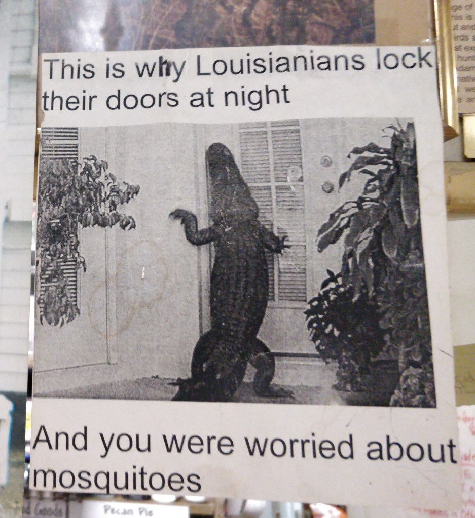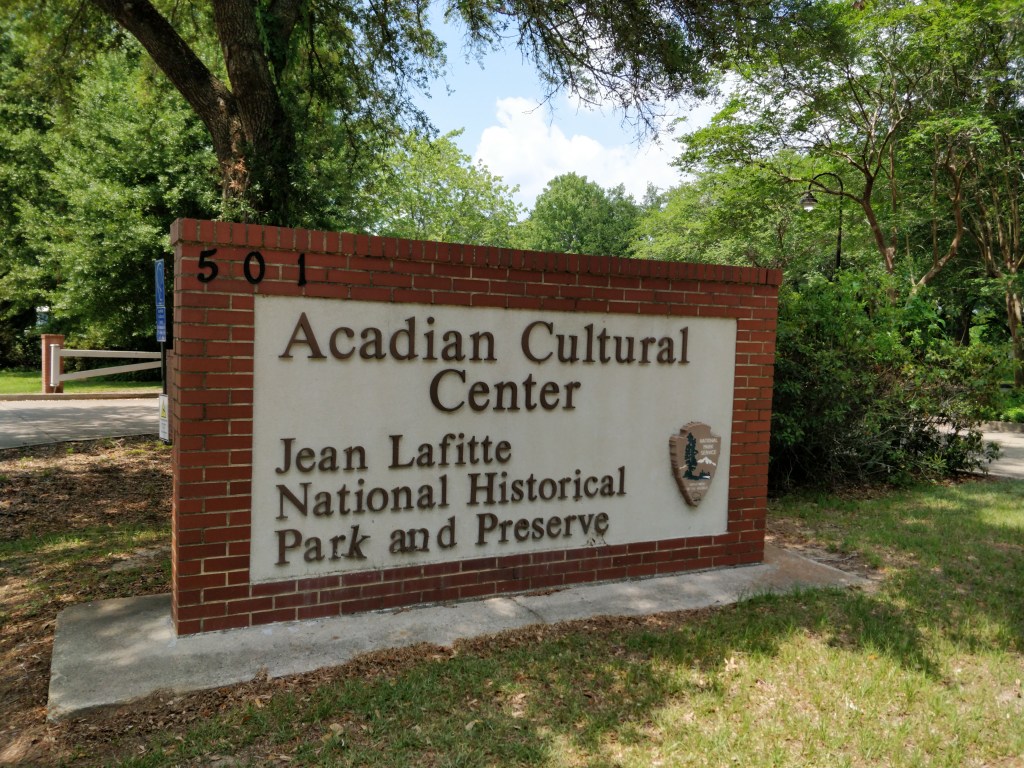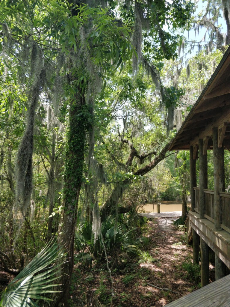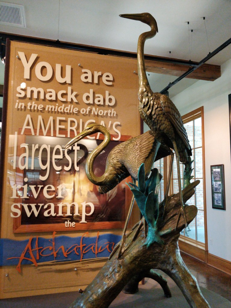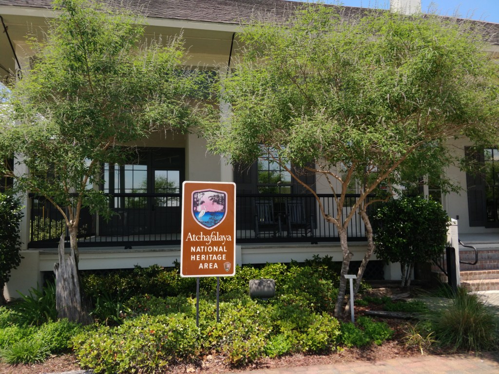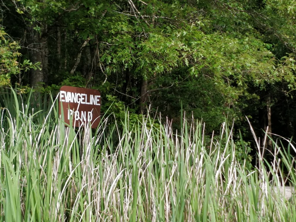 The friendly ambassadors gave us many great suggestions on exploring the wilderness areas as well as restaurants. The fun and quirky park film was a great orientation to the region and a history of the Acadie people (later known as “Cajuns”). Here we learned of Evangeline as made famous in the poem by Henry Wadsworth Longfellow. Separated from her lover when the Acadians were exiled from Nova Scotia, the ghost of Evangeline still waits by the bayous for him to join her in their new land. Streets, trails, ponds, stores, housing developments, medical centers, retail stores, and products of all sorts are named “Evangeline” here.