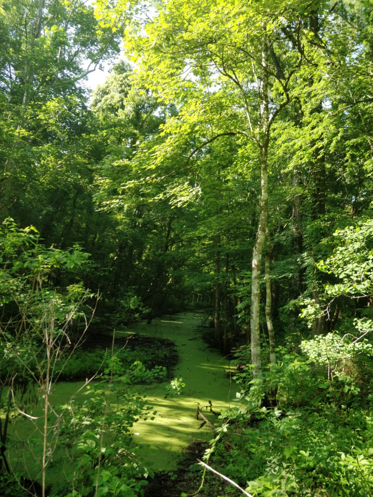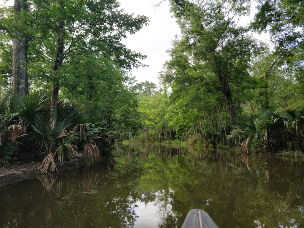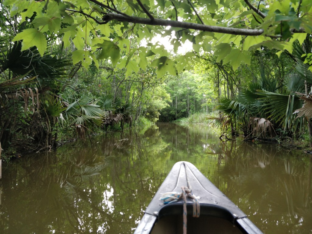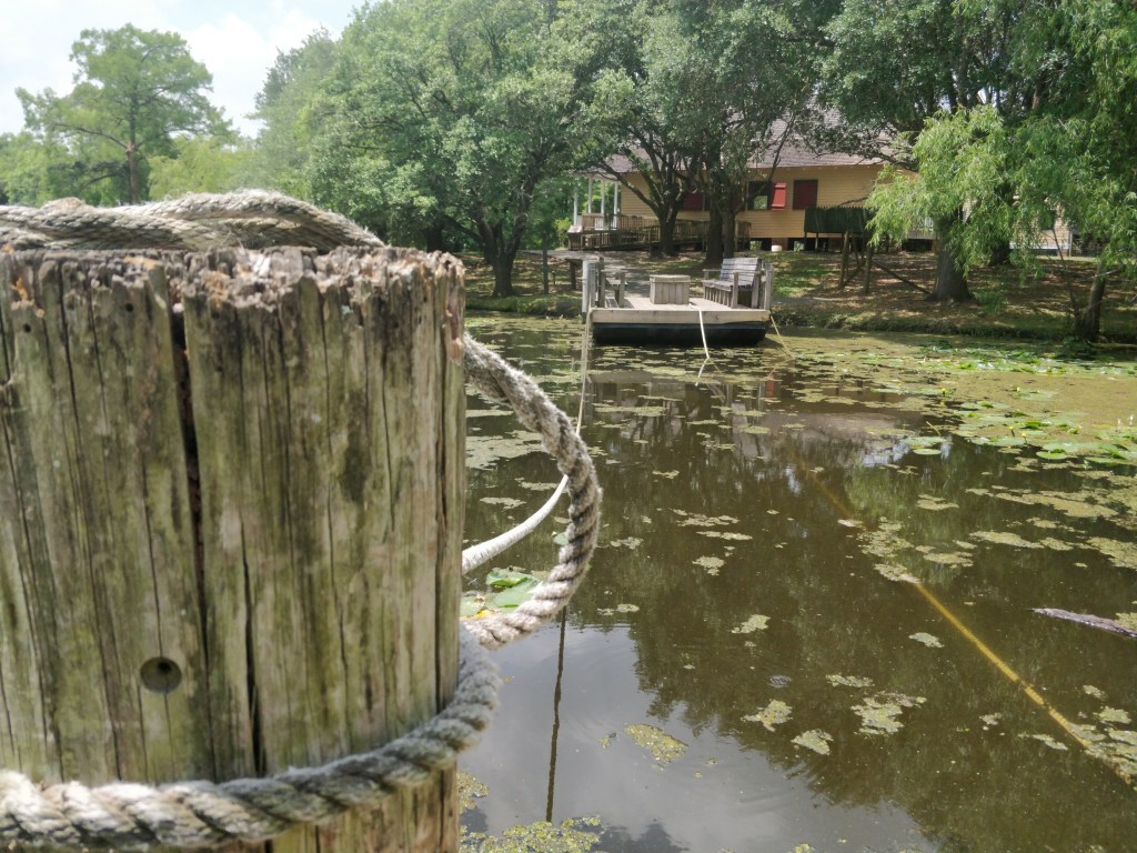 We rented a canoe one morning and paddled a waterway between three ponds (one named… Evangeline!) and the Vermilion River. We surprised a VERY big alligator in one of the channels that thankfully rolled and disappeared into the reeds at the edge of the water by the time we floated over the spot. We saw a pileated woodpecker, blue heron, vulture sitting on a branch overhanging the water, fish jumping, and we heard many different frogs, and contended with black flies.