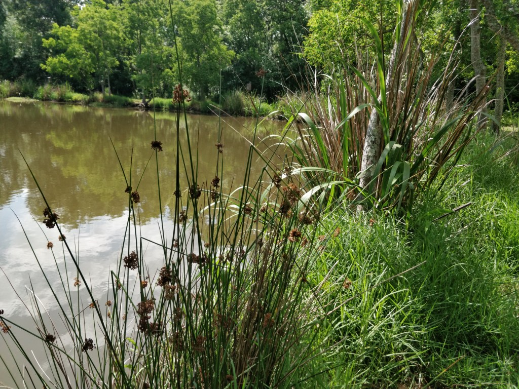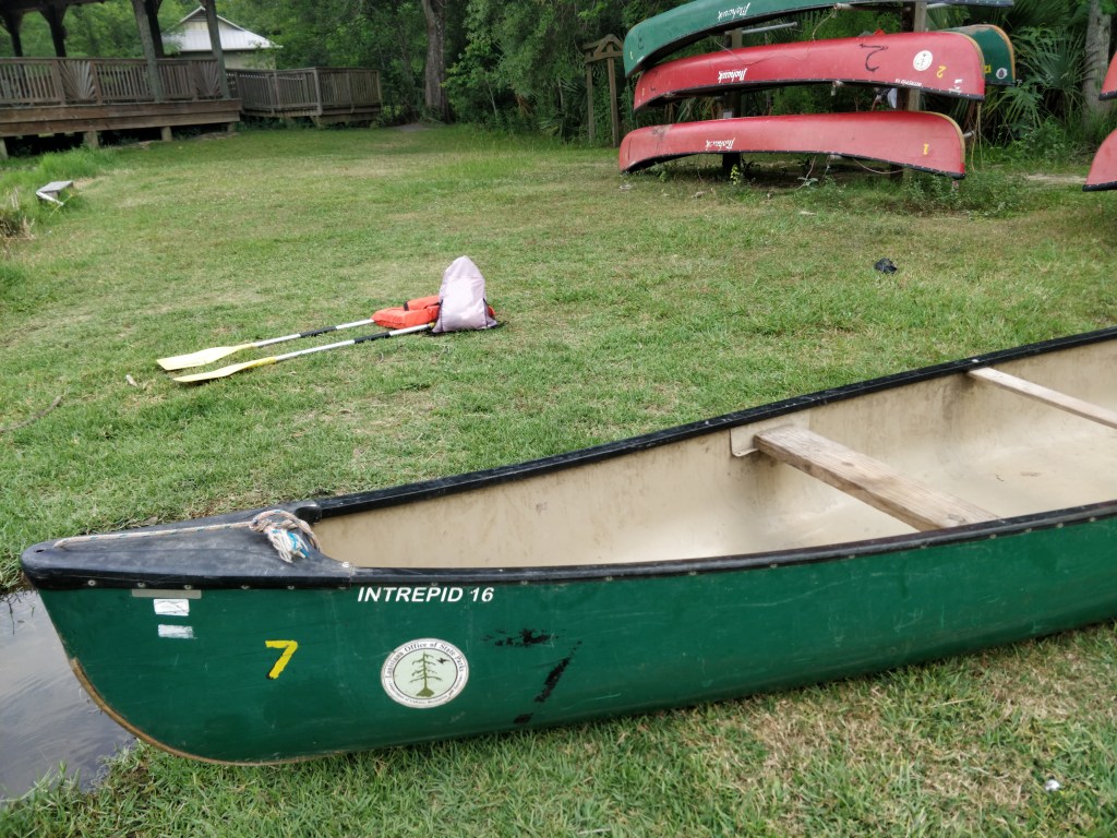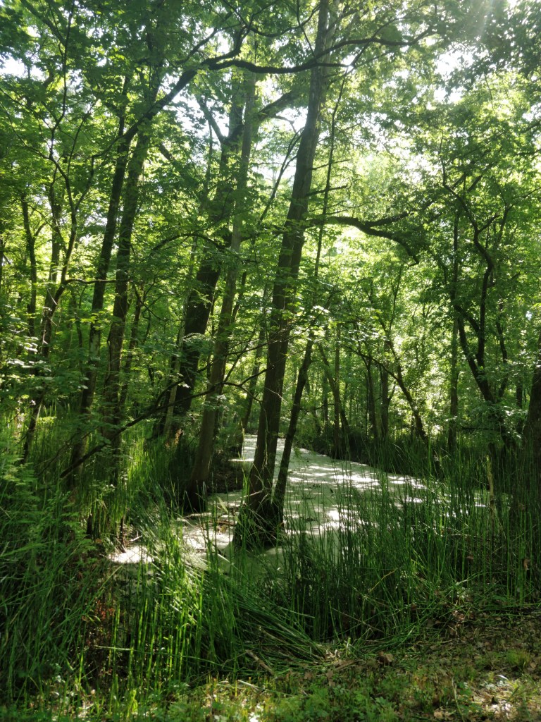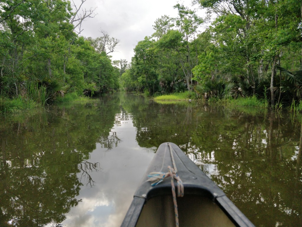 We rented a canoe one morning and paddled a waterway between three ponds (one named… Evangeline!) and the Vermilion River. We surprised a VERY big alligator in one of the channels that thankfully rolled and disappeared into the reeds at the edge of the water by the time we floated over the spot. We saw a pileated woodpecker, blue heron, vulture sitting on a branch overhanging the water, fish jumping, and we heard many different frogs, and contended with black flies.