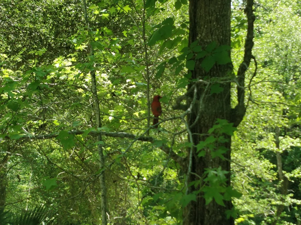 We had a few unusual wildlife encounters in the park. A dragonfly landed on one of our shoes and stayed there for several minutes. Every morning, a yellow warbler (Prothonotary) and a red cardinal kept fluttering at our truck’s side mirrors thinking there was a rival on the other side. The warbler soon gave up, but the cardinal kept at it for hours! A pair of wrens started to build a nest in the crook of our awning support one afternoon.