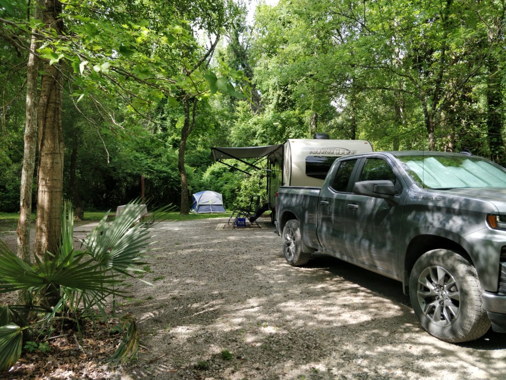 We stayed at Palmetto Island State Park for five nights. Gravel, back-in site was level and full hook-ups were near rear of site. Upon arrival, electrical was not working, but park staff quickly sent repairman to replace breaker. No other issues with hook-ups presented during our stay. Site was among trees with plenty of shade and privacy. Shower, bathroom and laundry facilities were in one screened-in building. All were air conditioned and clean. Trails were near the campground. State Park offers many amenities including a large splash zone, canoe rentals, observation platforms for lagoons, fishing, and picnic pavilions. Our site had a picnic table on a concrete pad and a fire ring with grill/grate. The site also had plenty of room for additional tent, hammock, or screen house. Ice and firewood were available at registration office. Campground was crowded on weekend but quiet hours were observed. Bring bug spray. This is an active alligator and bear area. Poor WiFi and cell service. Roads inside park were well maintained and wide. Easy access from State Route 82 but there is a lift bridge south of Perry with 14’ height clearance. We would stay here again and highly recommend Suire’s Grocery and Restaurant for authentic Cajun food.