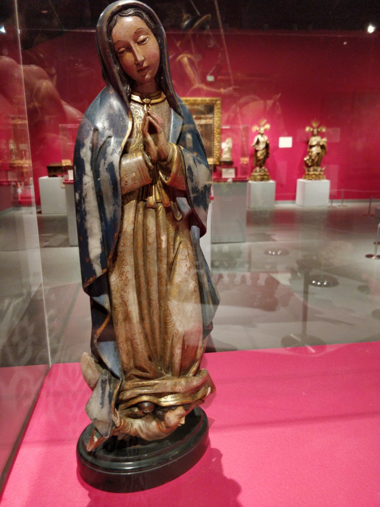Two separate portraits of a husband and wife hang in the gallery. The wife of Juan O’Donoju had come to Mexico from Spain but upon his murder, she lived out her life in isolation. The King would not allow her to return to Spain because Juan was considered a traitor for supporting Mexican Independence. Dona Josefa lived in poverty until her death 21 years later. See them “reunited” in an optical illusion through the display case…or is it????