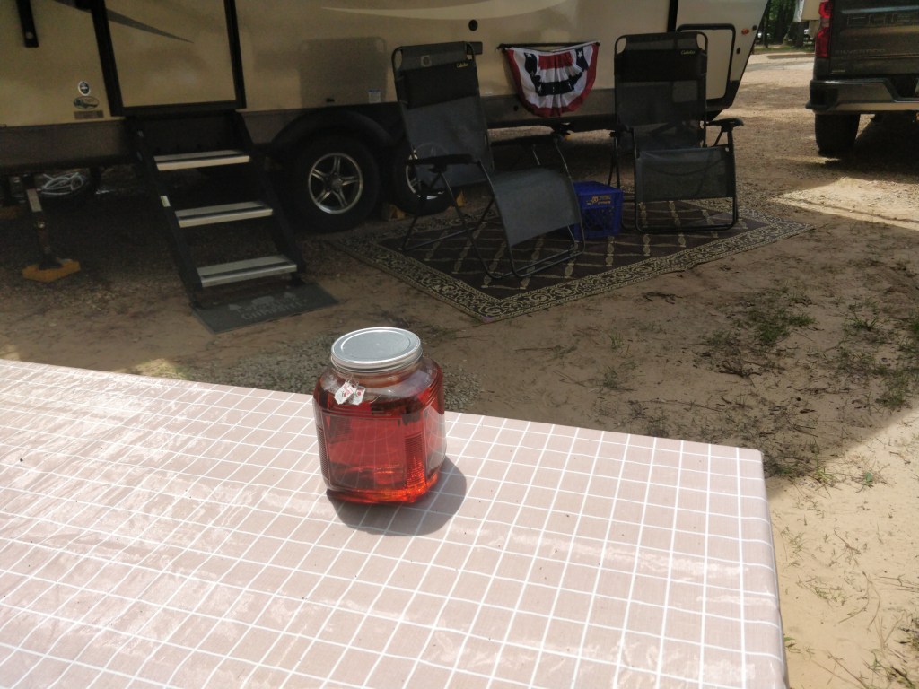 Instead of a campfire or charcoal grill, we have been using the Coleman camp stove for our outdoor cooking as well as using the electric rice cooker/steamer for our side dishes. The sunshine has been great for making sun-tea in camp.