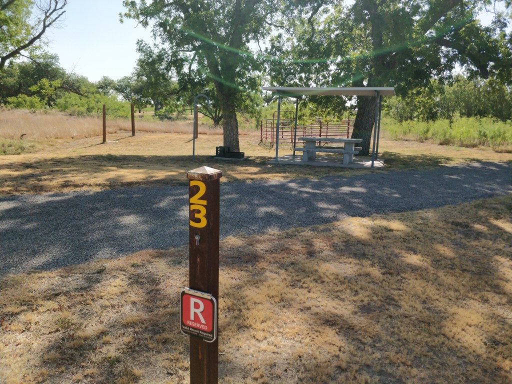 We stayed at San Angelo State Park for three days in a pull-thru, water/electric site. Sites are gravel, level and spacious. Each site has a picnic table, pavilion, fire pit, and grill. The southern campground has views of the lake access to many hiking trails. The northern campground has equestrian campsites and access to hiking and horse trails. The facilities are clean but old, no air conditioning, one shower stall and two flush toilets. Besides hiking/cycling and equestrian activities, fishing, boating (limited by shallow lake level), birding, and wildlife viewing are enjoyed. The park rangers were friendly and helpful with information for trails and activities. We had moderate T-Mobile service. The park was quiet and peaceful with beautiful sunsets and stargazing.