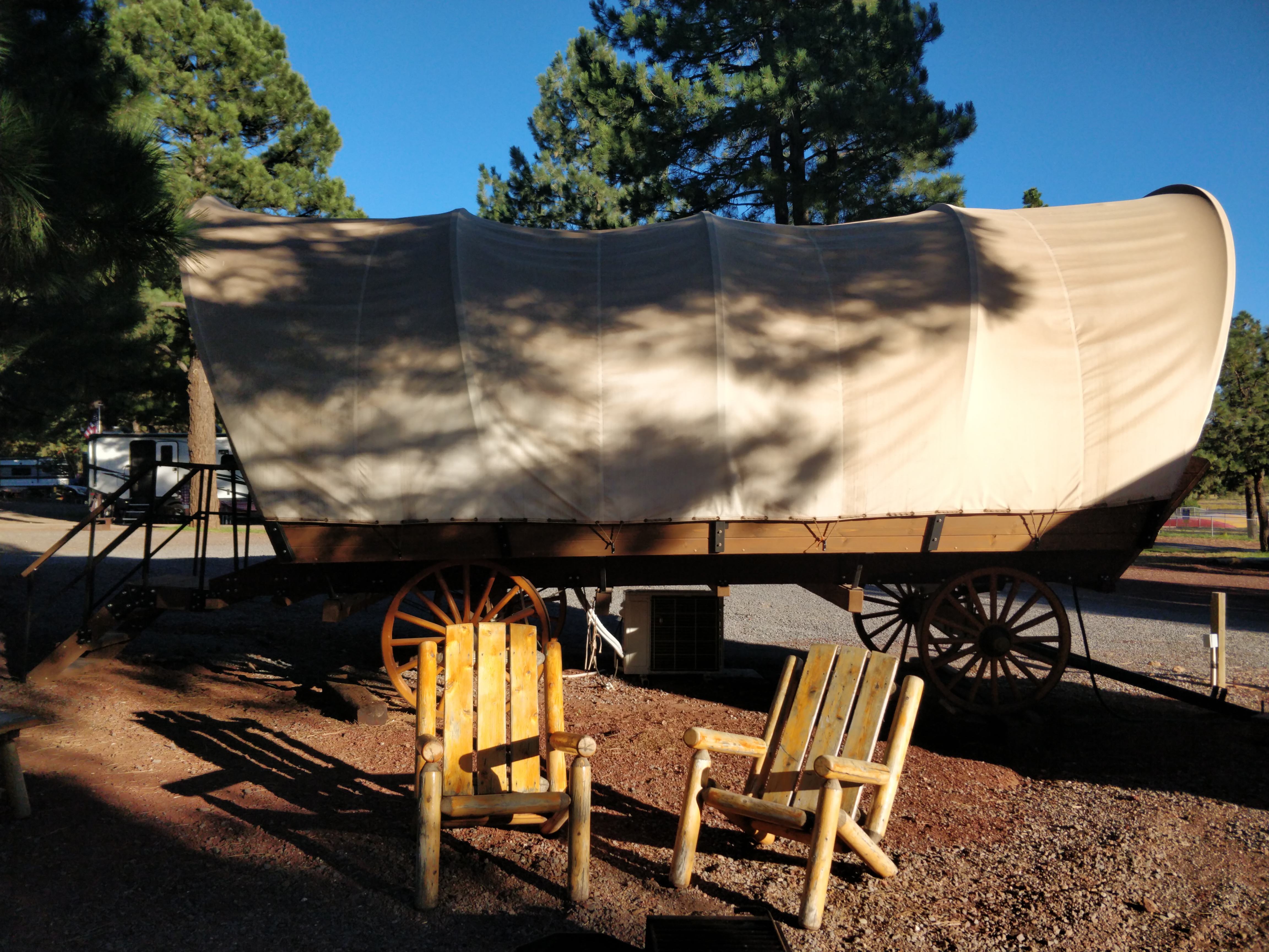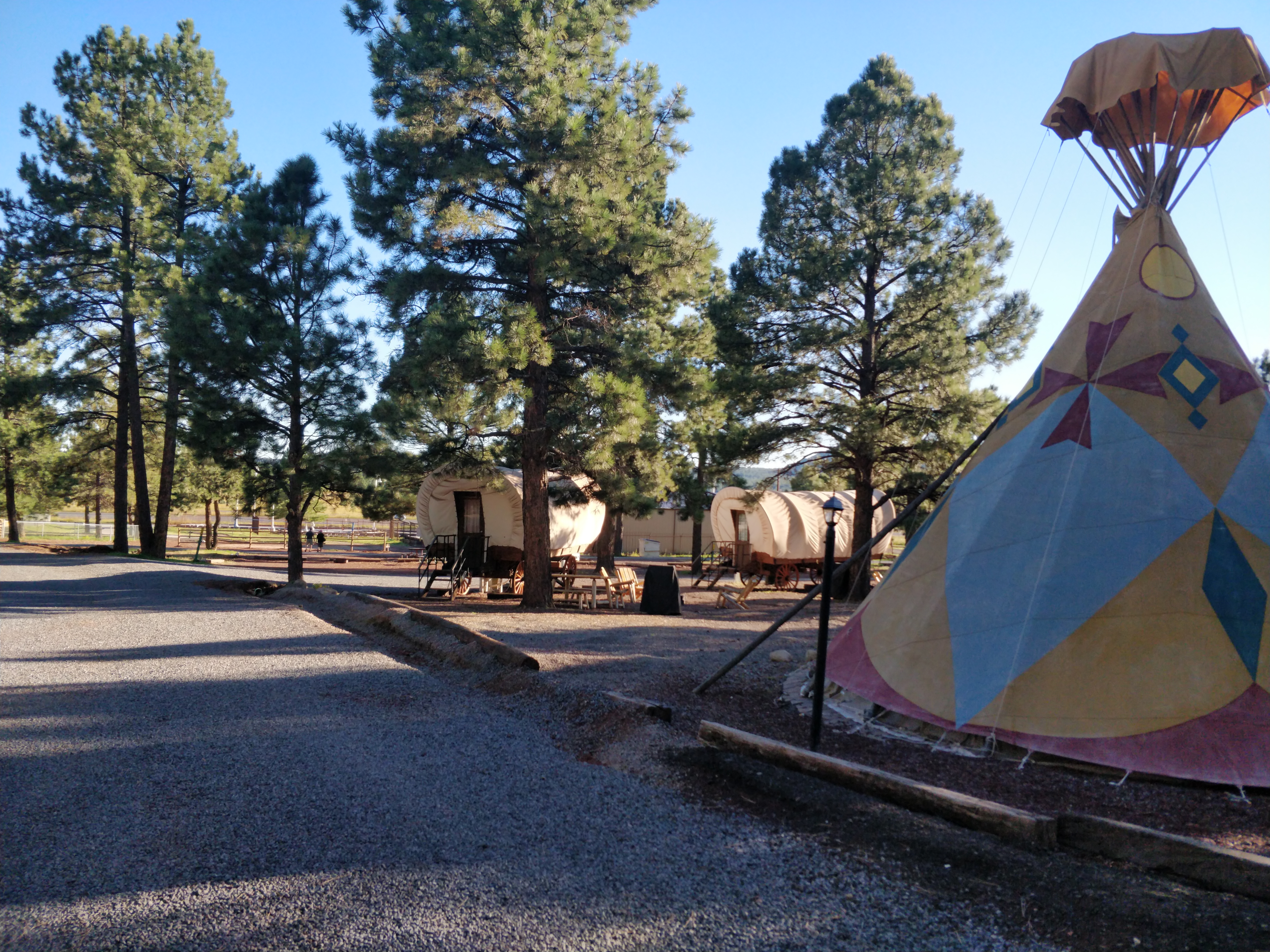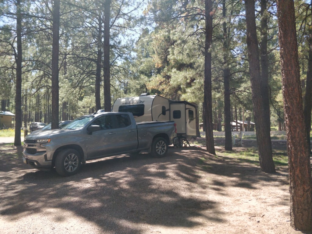 We stayed at the Williams/Circle Pines KOA for three days in a pull-thru water+electric site. Sites are gravel, level, and close together but plenty of room for slides. Most have trees or shrubs between. Picnic table and fire ring are at each site and we had good T-Mobile reception and WiFi. Located about an hour from the Grand Canyon, and easy access from I-40 at the Williams exit, this campground was a vacation destination itself. The property had a go-kart track and indoor swimming pool with two hot tubs in addition to a large playground, mini golf, horseshoes, and hiking trails. In addition to RV sites, the KOA had cabins and unique covered wagon and “Tipi” sites to rent. Hayrides and train rides were available several times each day as well. Showers, bathrooms and laundry facilities were clean and in good working order. There is a restaurant with outdoor picnic table seating which serves breakfast, snacks and dinner. The general store/gift shop is stocked with basic foods and beverages, camping items, and some parts for RVs. We found the office and campground staff to be friendly and efficient.