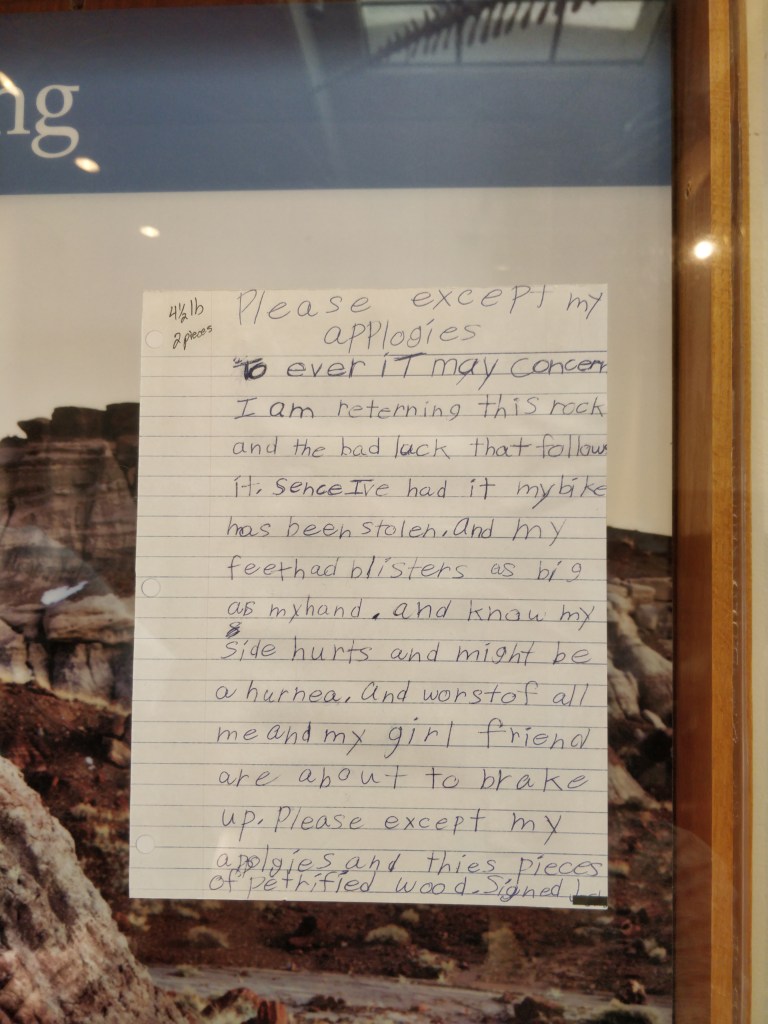 Besides being against Park policy to take any fossil, rock, or piece of petrified wood, it seems to be just plain bad luck to do so: