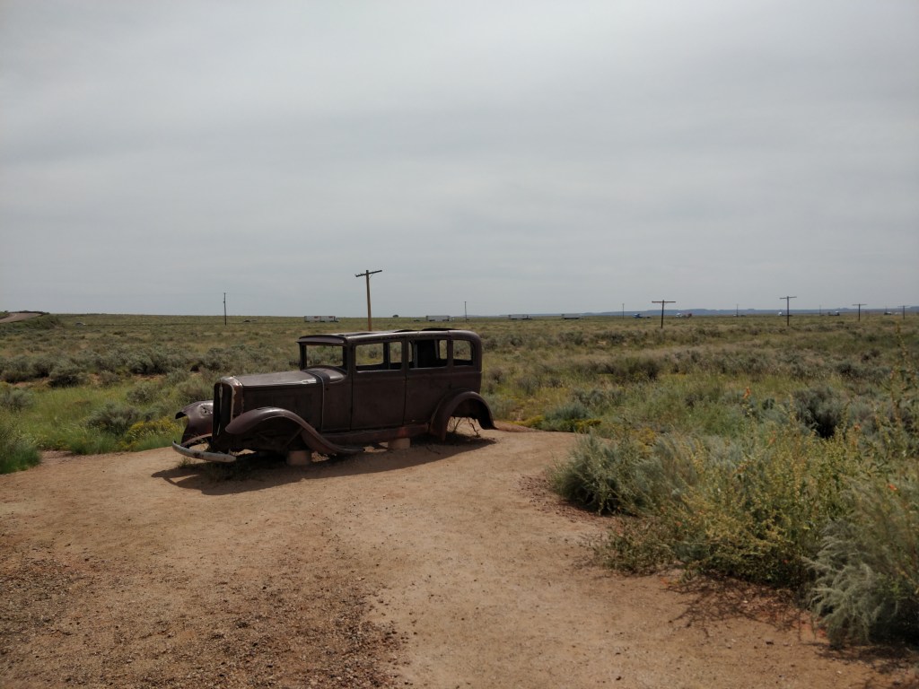 Petrified Forest is the only national park that preserves a section of Route 66 within its boundaries. Vintage posters from the 1930’s and 40’s advertised the grandeur of the park to encourage motorists to take the trip of their dreams. A small memorial to the road is located in the park. Only the telephone poles remain to mark the “Mother Road.”