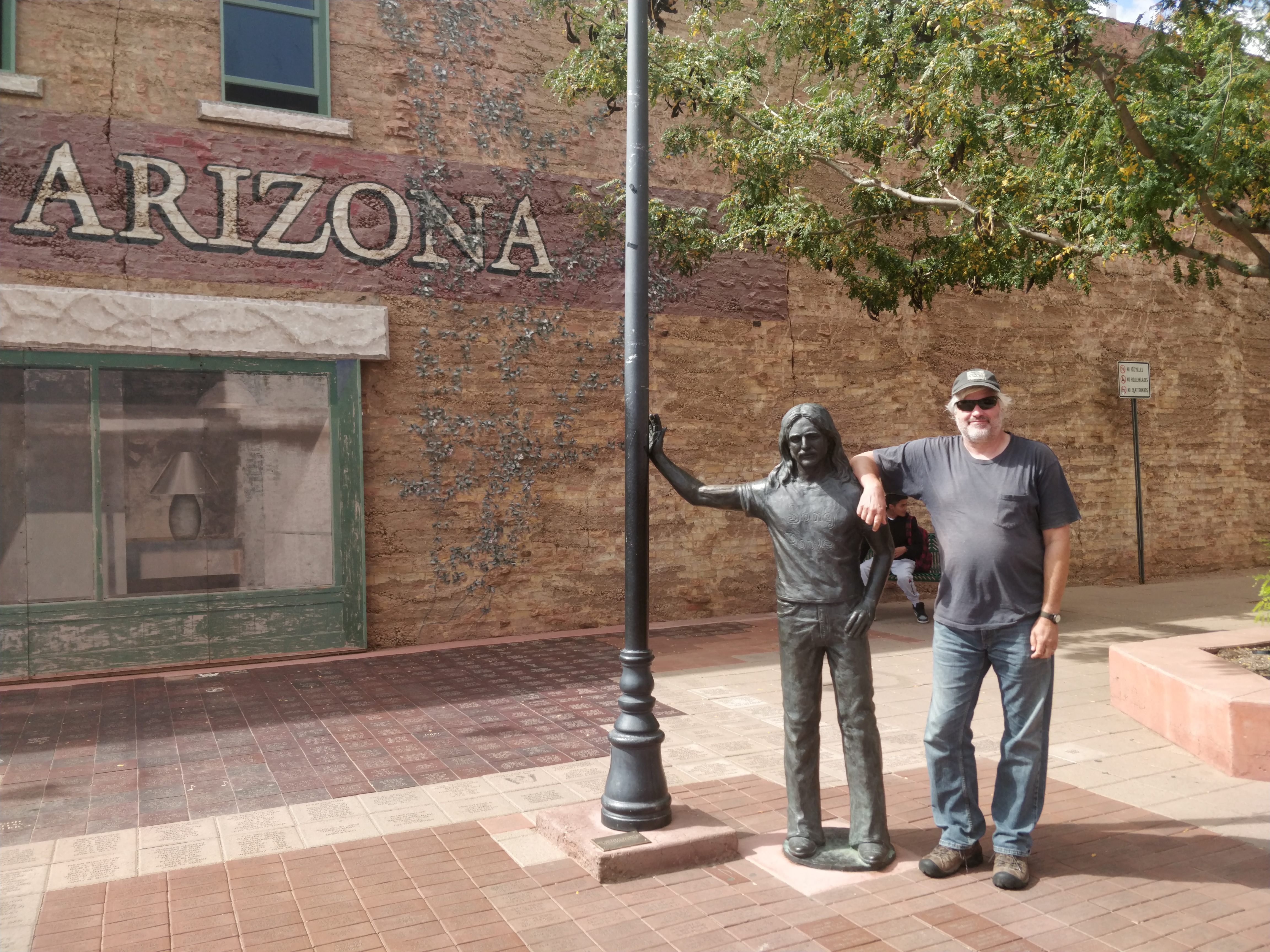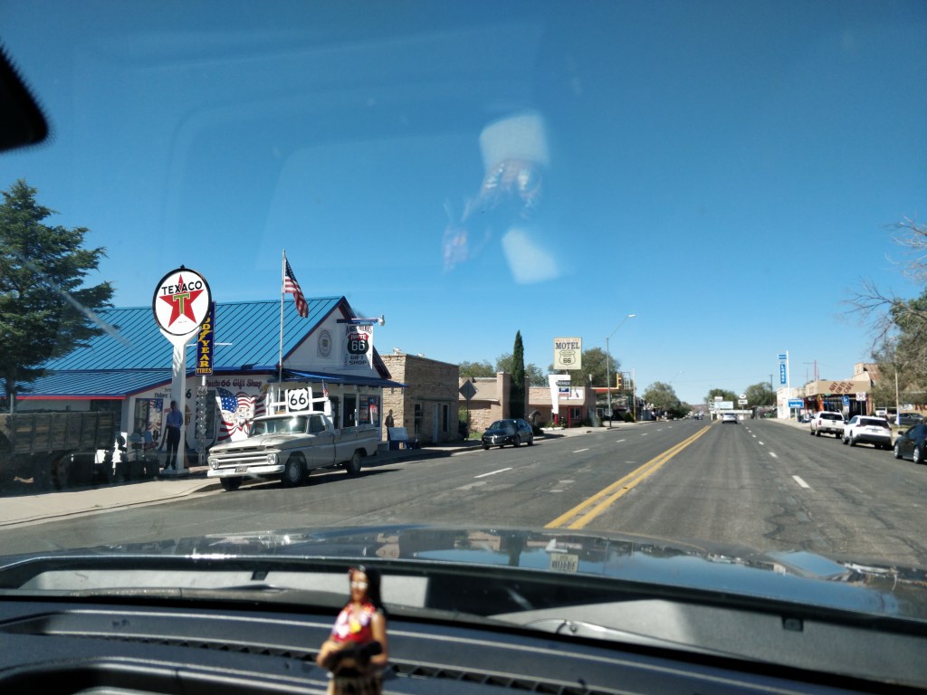 In true Route 66 quirkiness, Winslow has commemorated THE corner where statues, murals, gift shops and restaurants all invite the visitor to stand and “Take It Easy”! With a huge Route 66 emblem painted in the middle of the intersection, a flatbed ford parked on the street, packs of Harleys roaring past, and the Eagles’ music playing from the corner shop filled with the band’s memorabilia, the song literally lives here. The food at the Flatbed Ford Cafe was good, too!
