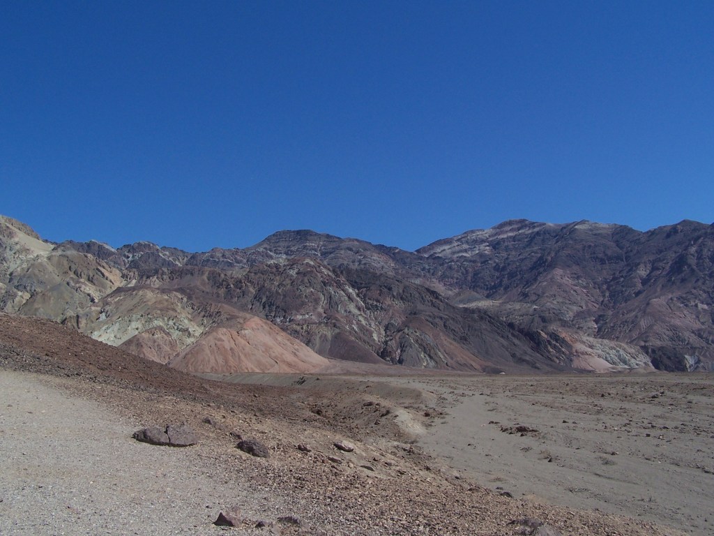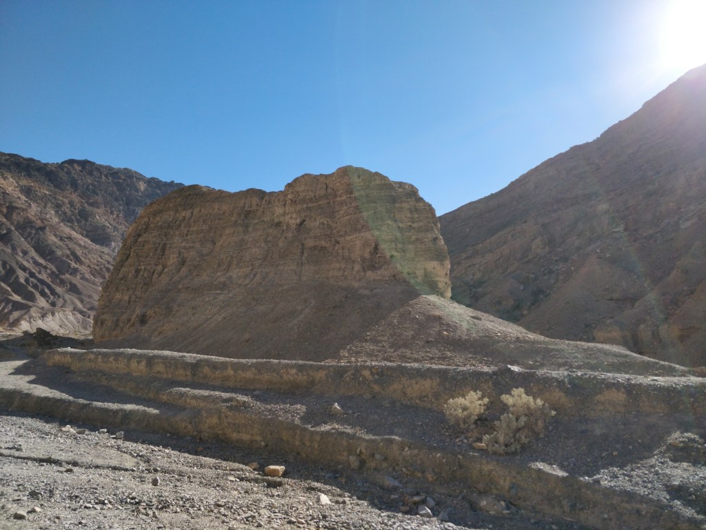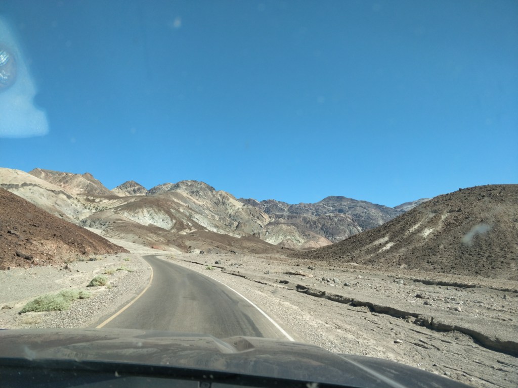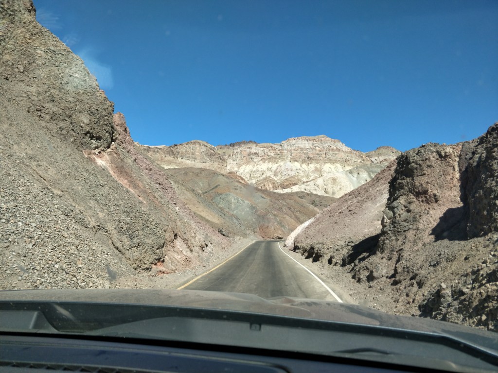 Looping around and heading south back towards Badwater Basin, we took the scenic Artist’s Pallet Drive. This nine mile one way road leads into the remnants of one of Death Valley’s volcanic periods. Rock formations, washes and hills are colored from mineral deposits in pale green, yellow, periwinkle blue, pink and rose. The winding roller-coaster road provides dramatic views around each corner and over each hill.