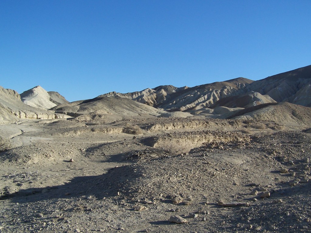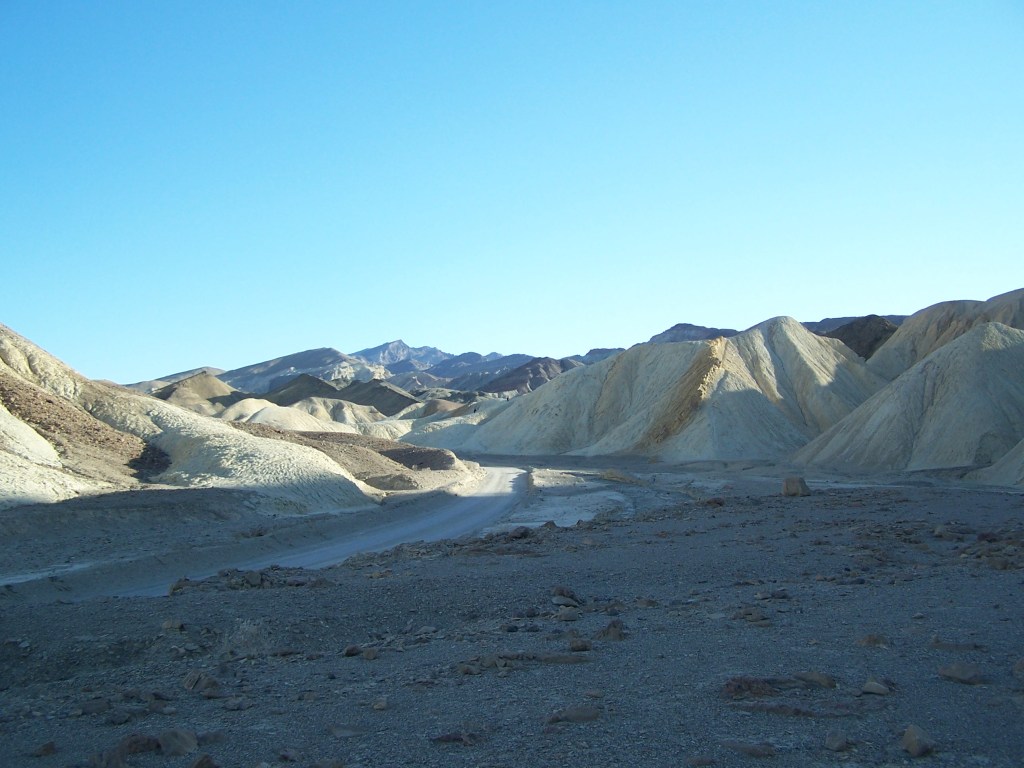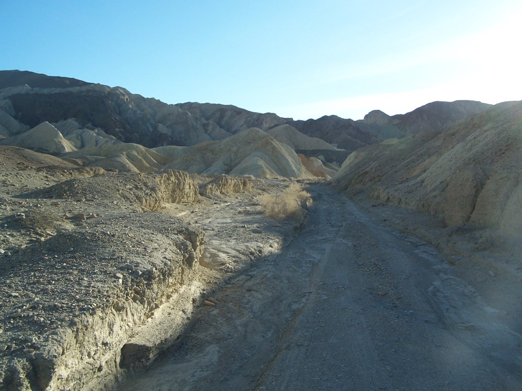 From Badwater Basin and Dantes View, we travel north to a one way dirt road loop into the 20 Mule Team Canyon. Twisting through light yellow hills of eroding badlands, we follow the path that the famous mule teams hauled wagons of borax ore from the Harmony Borax Works at the center of Death Valley. More recently, this area has been used in several movies, including Star Wars!