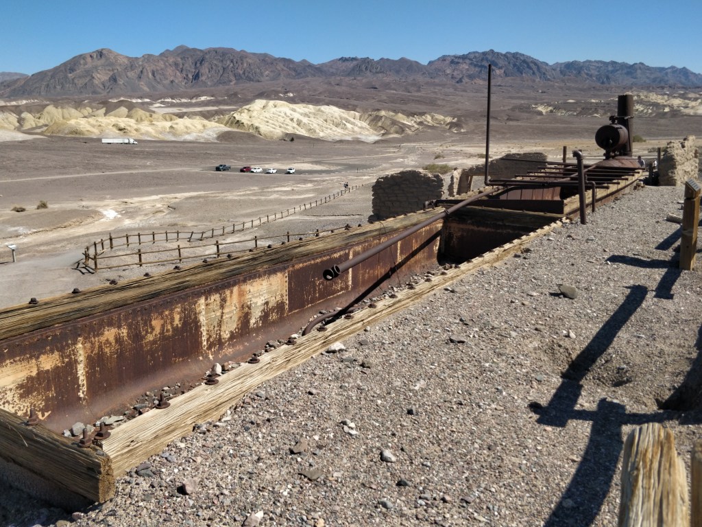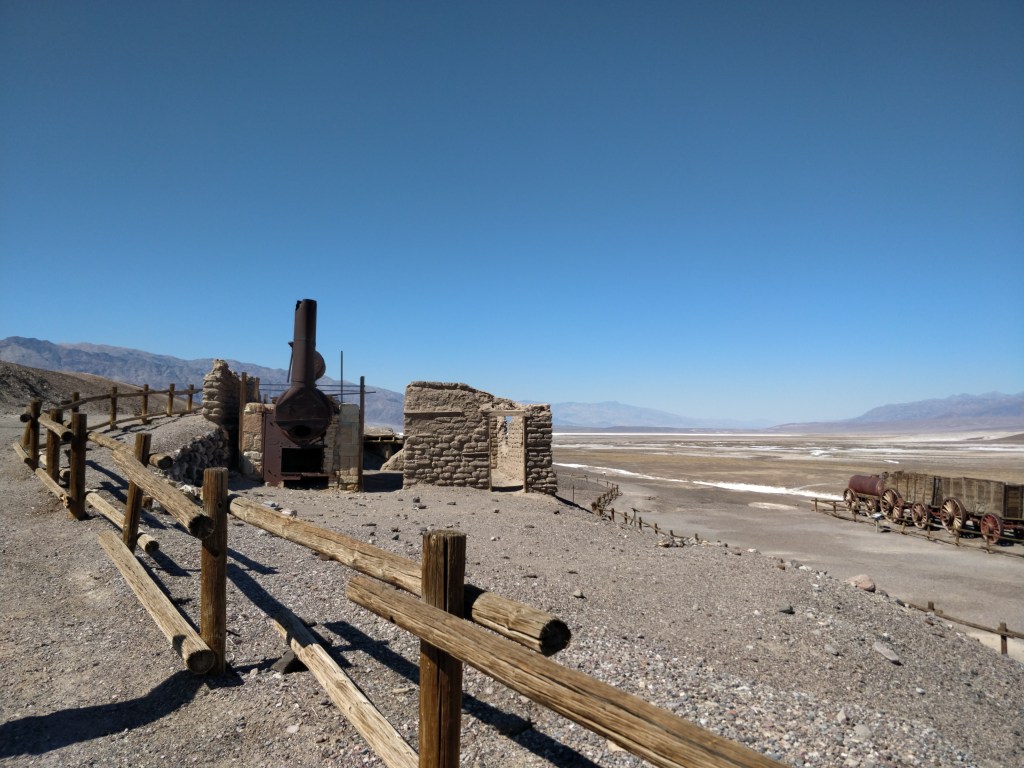 Remains from a borax mining operation have been preserved on the site where the Harmony plant operated in the 1880’s. The borate ore looked like cotton balls laying on the surface of the salt pan playa. Evaporation and crystallization were used to refine the ore into borax. When running at capacity, the mine employed 40 men to produce three tons of borax daily! The famous 20-mule teams were used to haul borax to the railroad located 160 miles away. Averaging about two miles an hour, it took 30 days to complete a round trip. After five years, the plant closed due to financial setbacks, lack of transportation, and the harsh conditions of the valley.