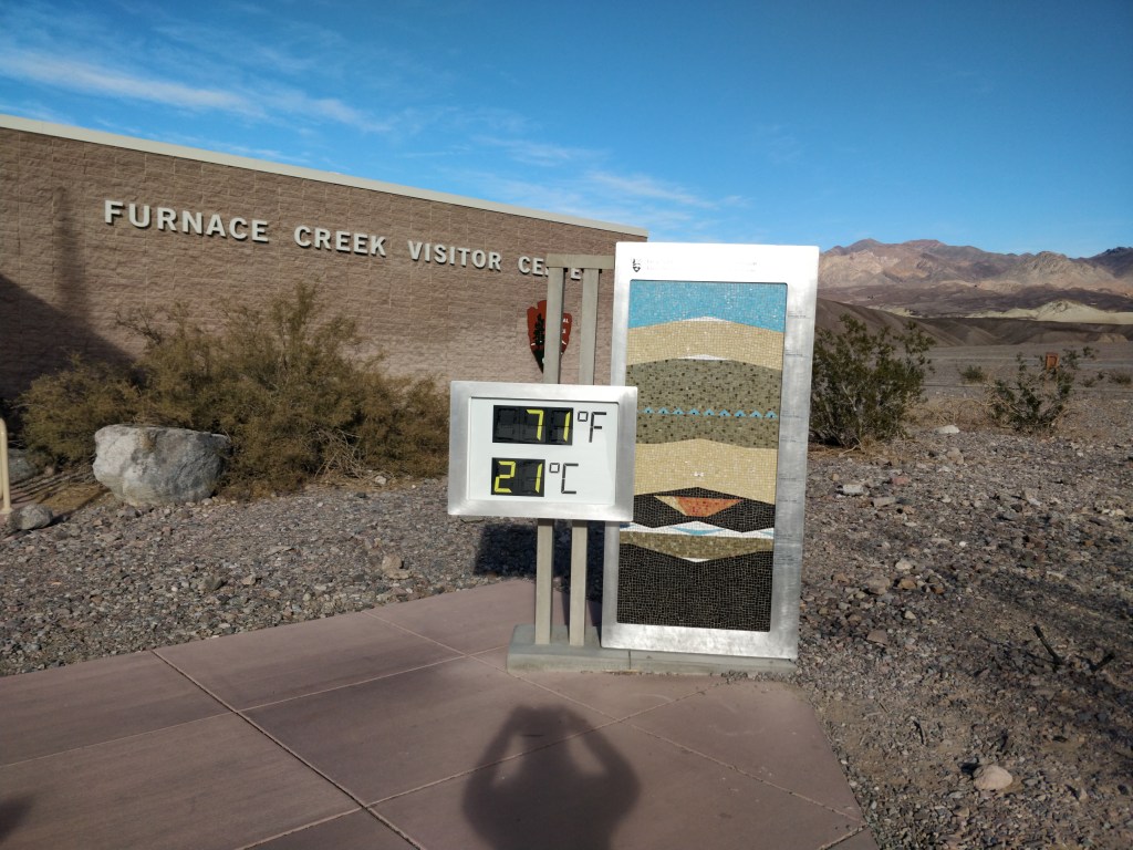 The Visitor Center located at Furnace Creek is a must for excellent information on park activities. Park Rangers staff the information desk and provide maps and directions to make the most of every visit. The daily Ranger Talks and Hikes schedule is posted inside and other announcements can be found on the bulletin boards posted at the exterior of the building near the large current temperature display. Natural History exhibits of the wildlife, plants, geologic and historic features are on display inside the center as well. The gift shop has excellent area maps and books for sale plus beverages, snacks and souvenirs. Only a few picnic tables and benches are located around the exterior of the building.