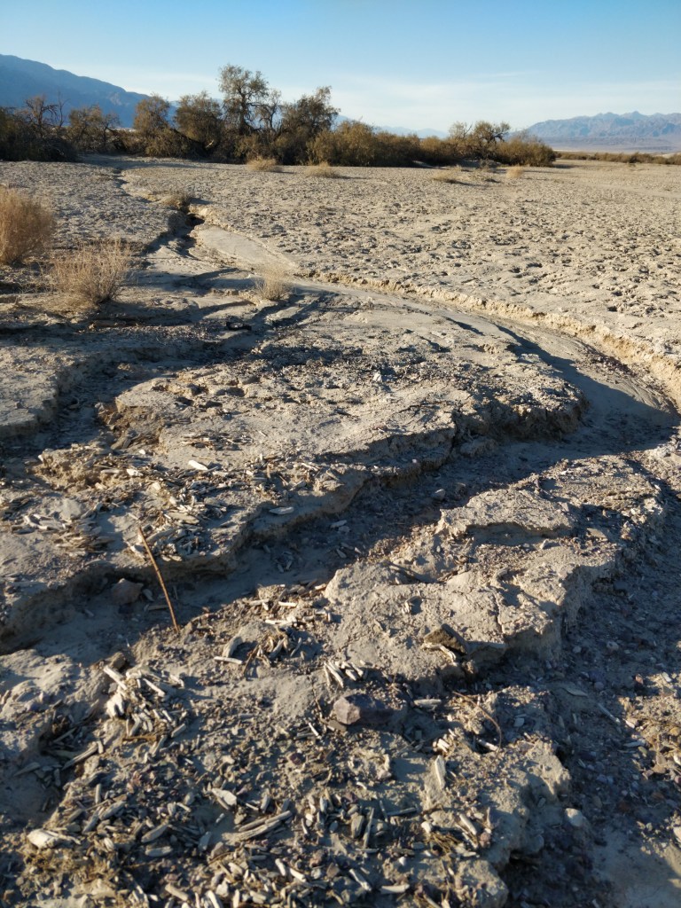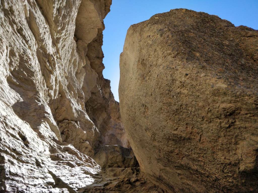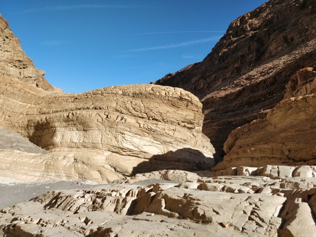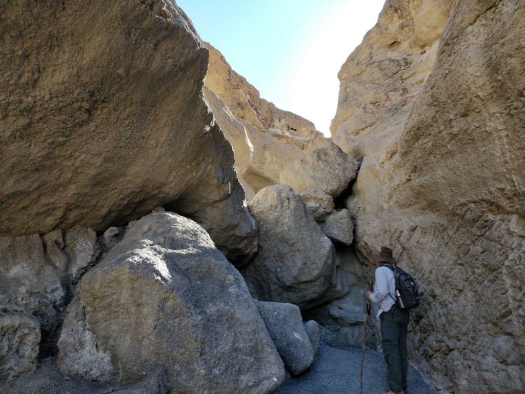 One of the most popular hikes in Death Valley is into Mosaic Canyon. This was a breathtaking hike (in more ways than one). The dramatic entrance follows narrowing walls worn smooth from the rushing water draining the nearby Tucki Mountains during rainstorms. The canyon widens into a large area called the “amphitheater” where the deep gravel floor winds around buttes, rock formations, and boulders. Continuing on, the canyon narrows again until it reaches a 40 ft. high dry falls. Other pathways lead up and around this obstruction for a more agile hiker. On the return trip, the views from this geologic wonder were just as stunning as the canyon spills out onto the flat desert.
