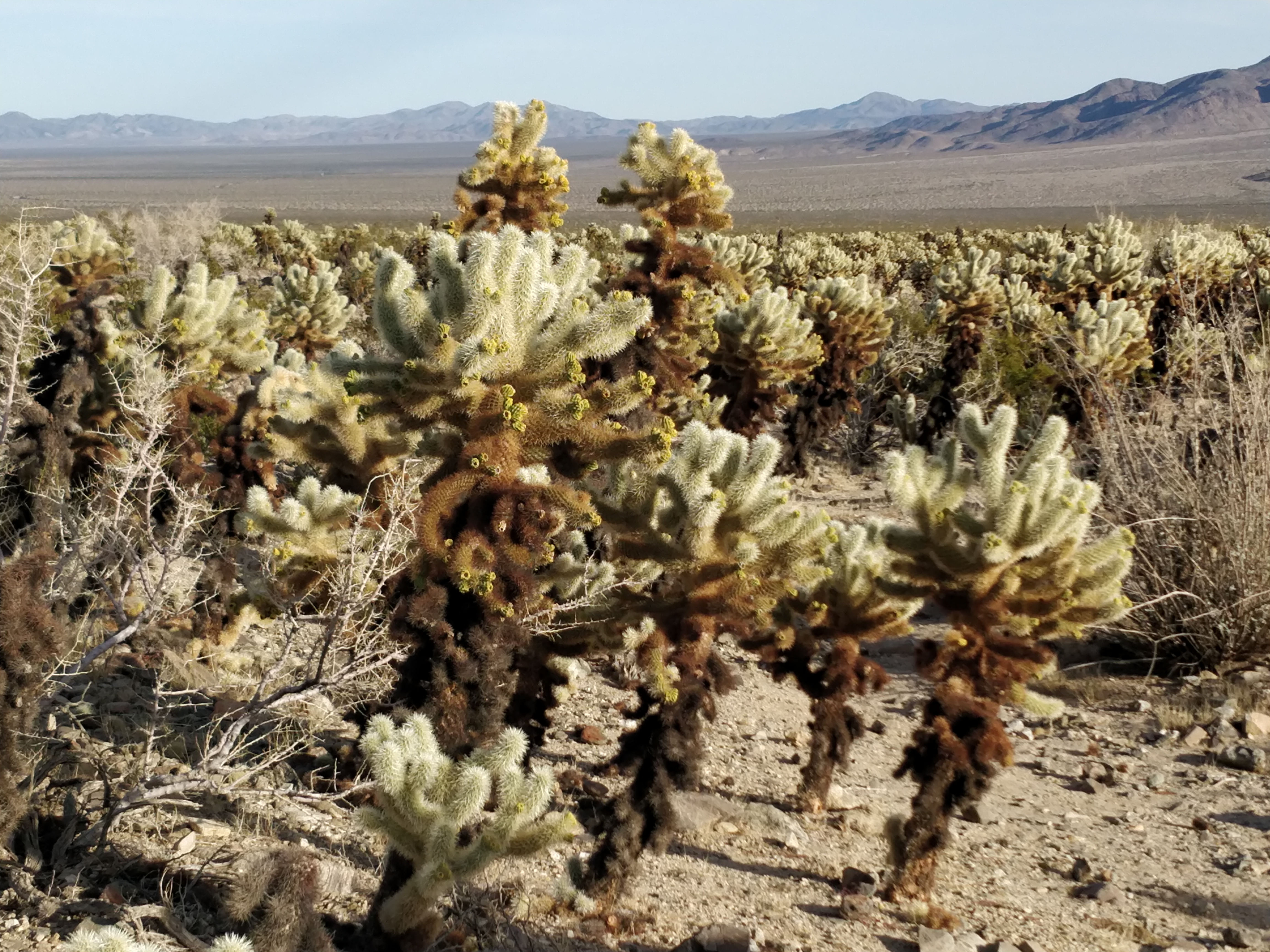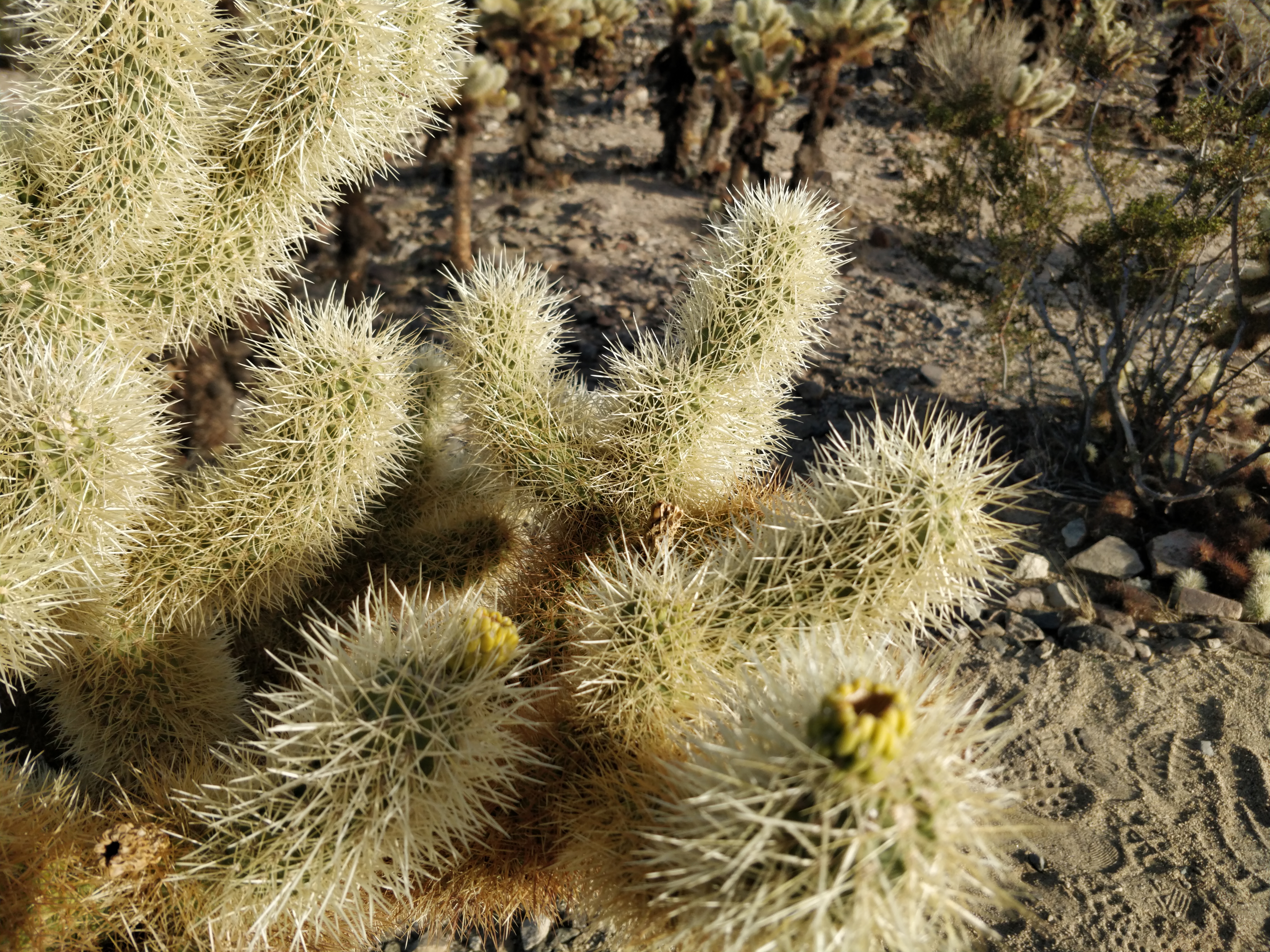 Cholla cactus, nicknamed “Teddy bear cactus”, may look soft and fuzzy, but don’t be fooled! Those spines prick and jab and are hard to remove from clothing or flesh. Their yellow “flowers” bloom in spring.