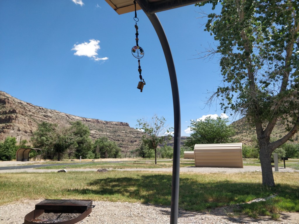 We stayed in the James M. Robb Island Acres State Park campground located in Palisade, Colorado for seven nights. Our pull-thru site with full hook ups included a picnic pavilion, fire pit, grill, and picnic table. We were a few steps away from the river and walking path. Showers and flush toilets were available in the central building and pit toilets were in each campsite loop. Facilities were clean. A couple ponds were open for swimming, fishing and kayaking/canoeing. We encountered some gnats and mosquitoes during our stay. Lighting was low throughout the park to allow for good stargazing. The campground is located near the highway and across the river from train tracks, so there is a significant amount of traffic noise, but manageable. The reservation website warns visitors about the noise level. The roads were well maintained and the sites were spacious. There is a separate daily fee required for admittance to the state park in addition to the nightly camping fee. We would return for a short stay only.